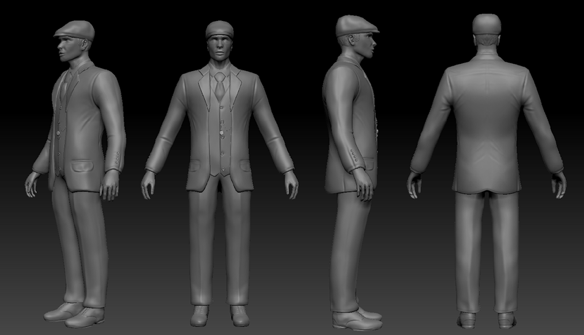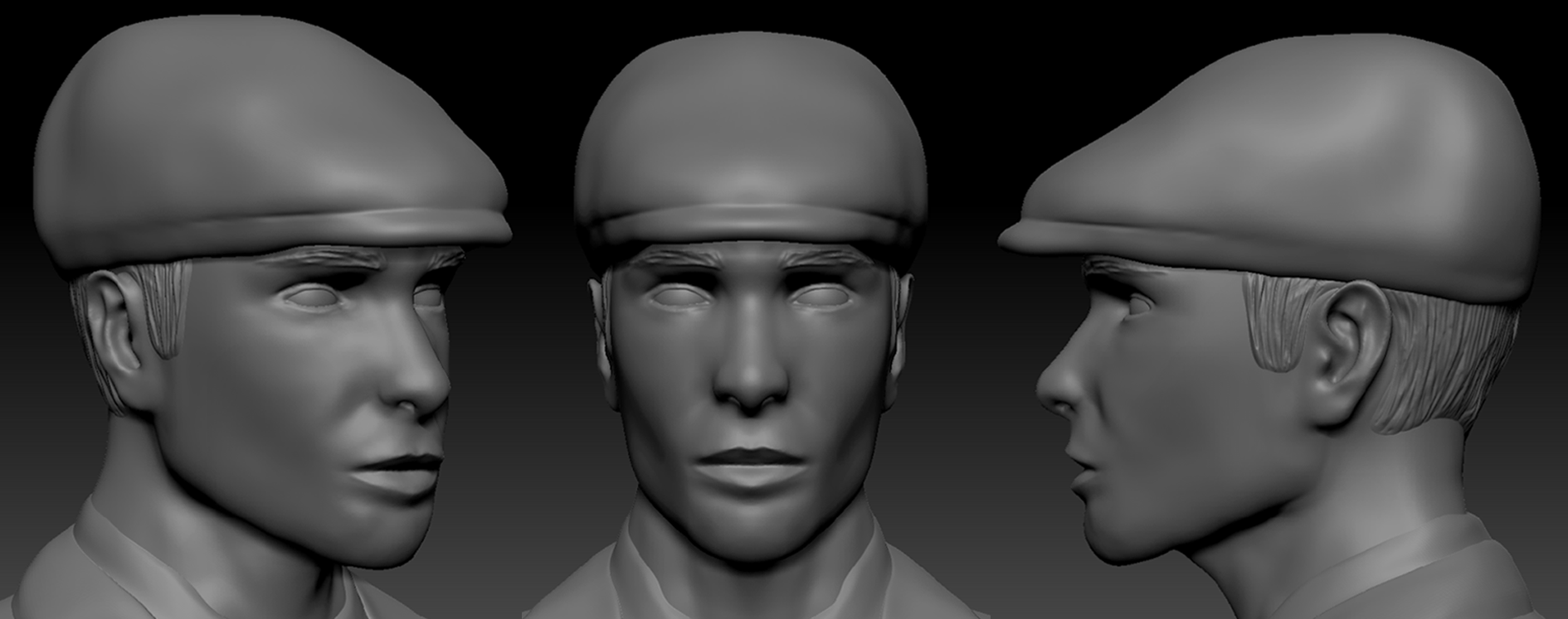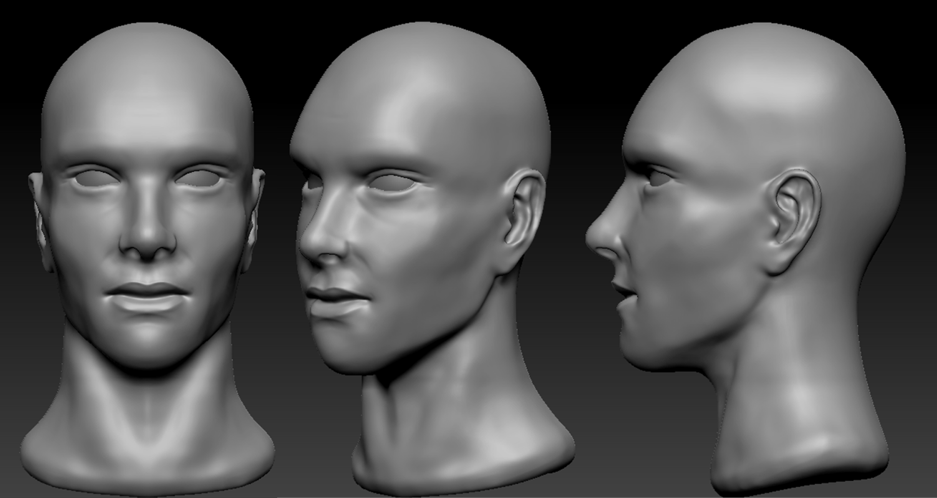 Different sculpts I have created in ZBrush, including a posed semi-realistic male, and a practice sculpt of a male head.